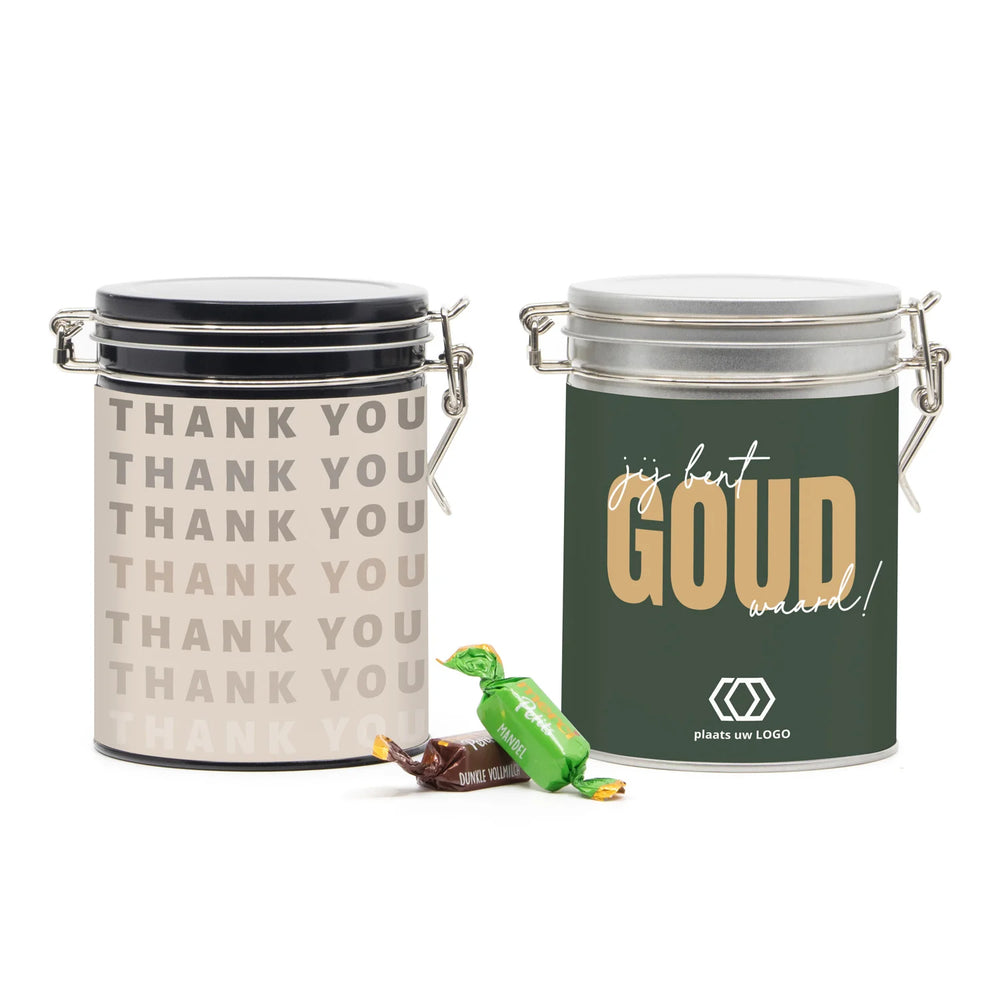 Merci voor je inzet. Een mooi snoepblik met beugelsluiting, voorzien van een eigen wikkel en afgevuld met een zak Merci petits chocolaatjes. Een blik die je helemaal kunt personaliseren met een eigen ontwerp. Silver finish afwerking en luchtdichte sluiting door middel van een beugel. Een mooi en persoonlijk geschenk voor collega's of klanten.