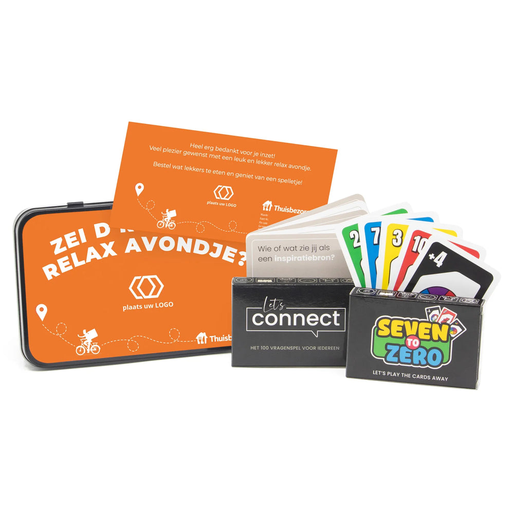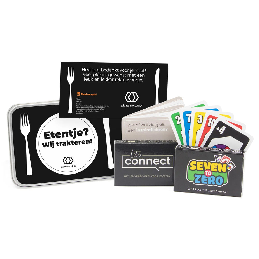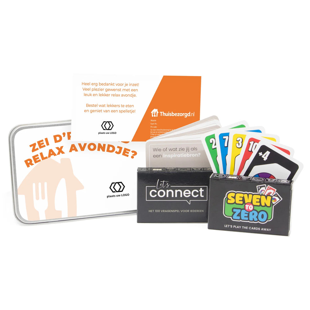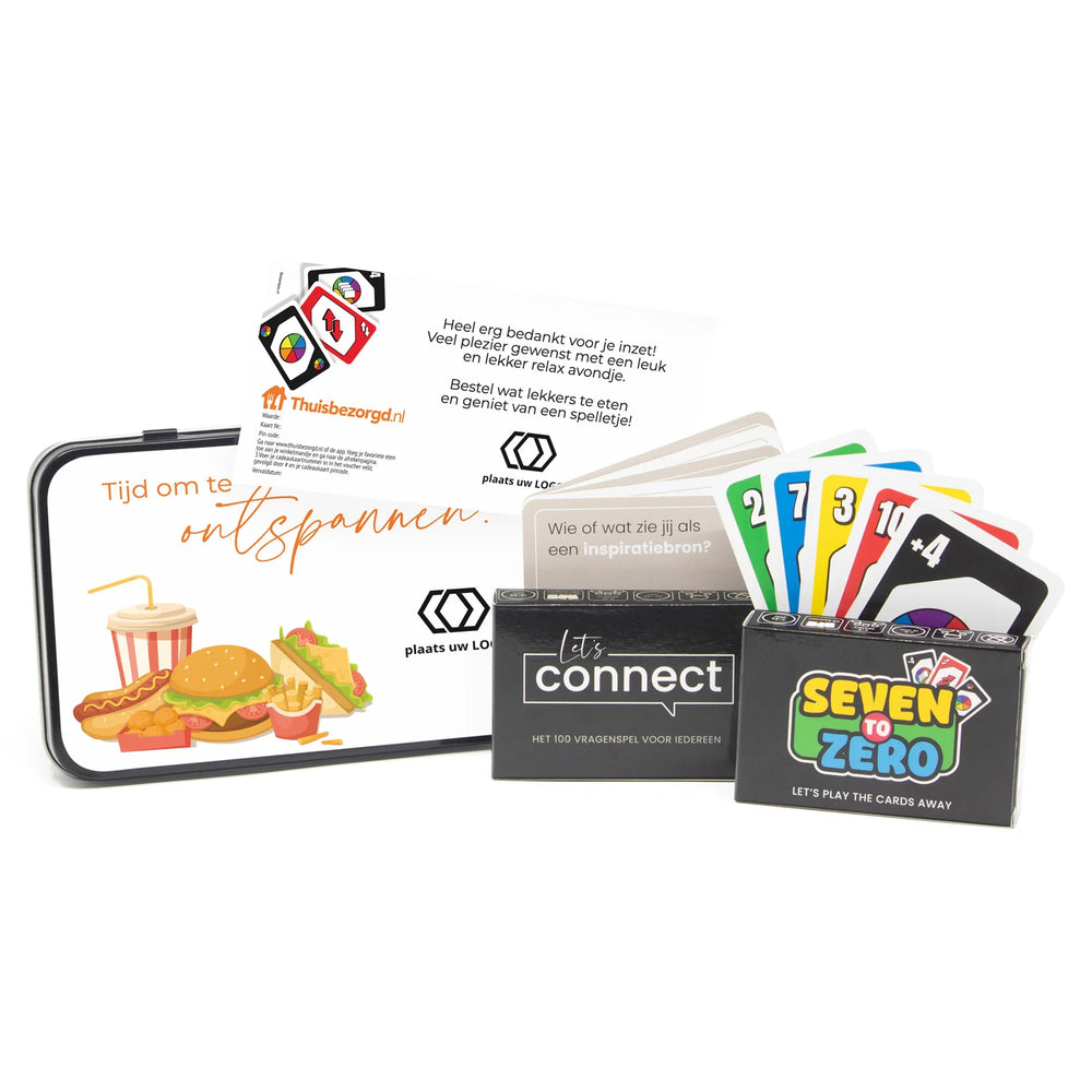 In het stijlvolle metalen blik vind je alles voor een complete avond thuis. Begin met een lekkere maaltijd naar keuze via de Thuisbezorgd-vouchercode – jij bepaalt zelf de waarde. Terwijl het eten onderweg is, leer je elkaar beter kennen met ons exclusieve 100 vragenspel: Let’s Connect. En zodra iedereen is opgewarmd, kan de strijd losbarsten met het gezellige kaartspel Seven to Zero – geschikt voor jong en oud.