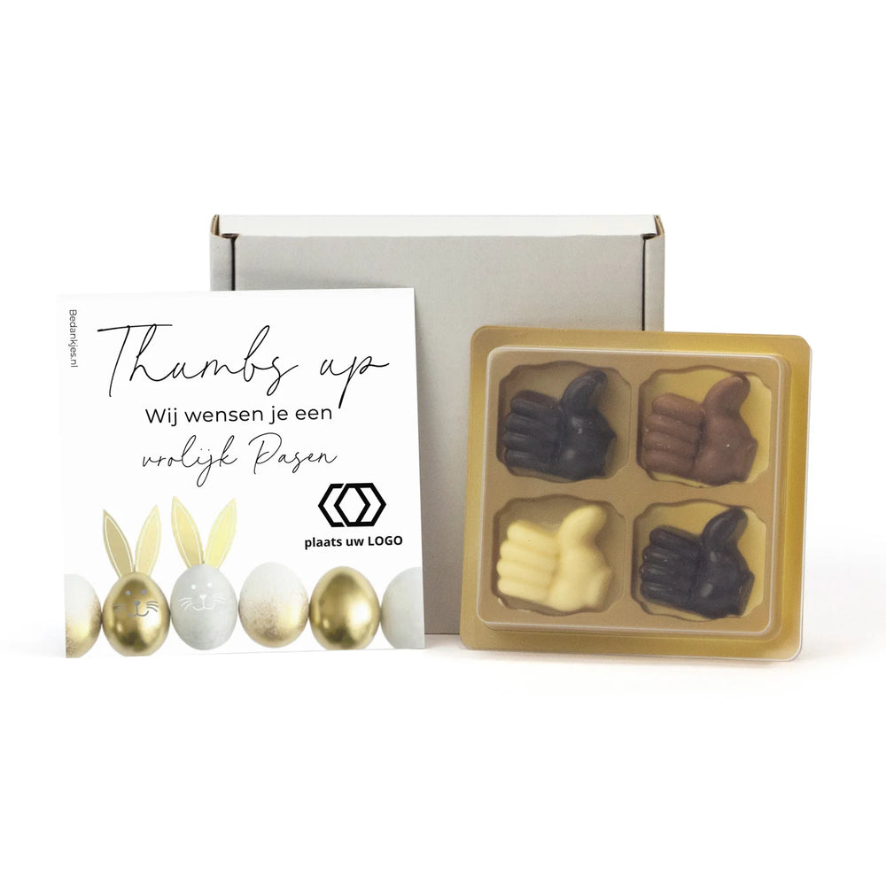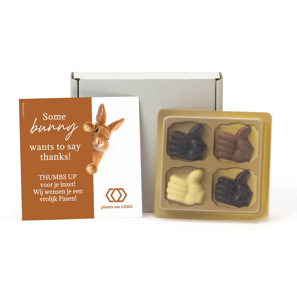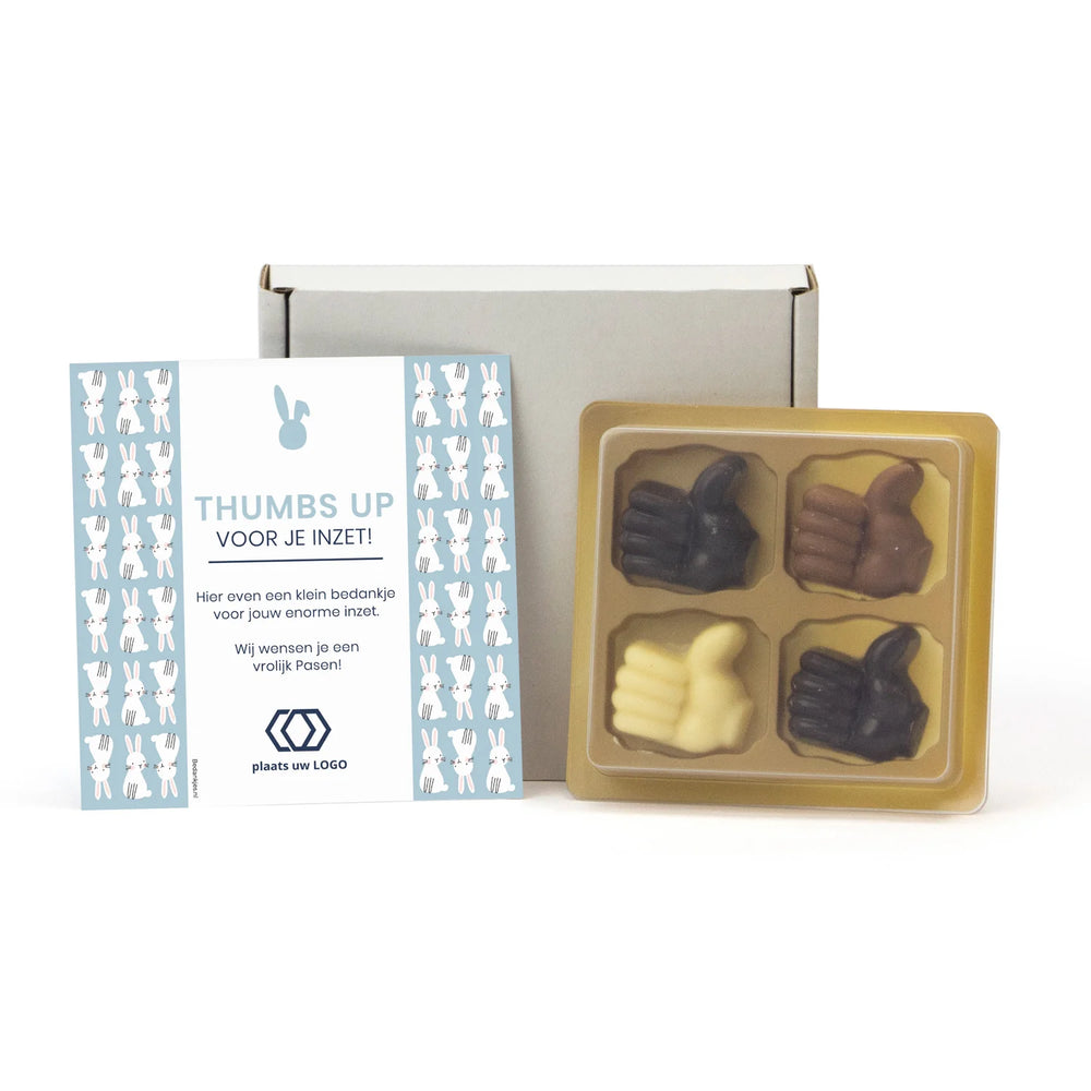 Thumbs up voor je inzet! Een leuk doosje met 4 heerlijk massieve chocolade duimpjes en persoonlijke (paas)kaart die je zelf online kunt ontwerpen in onze ontwerptool.